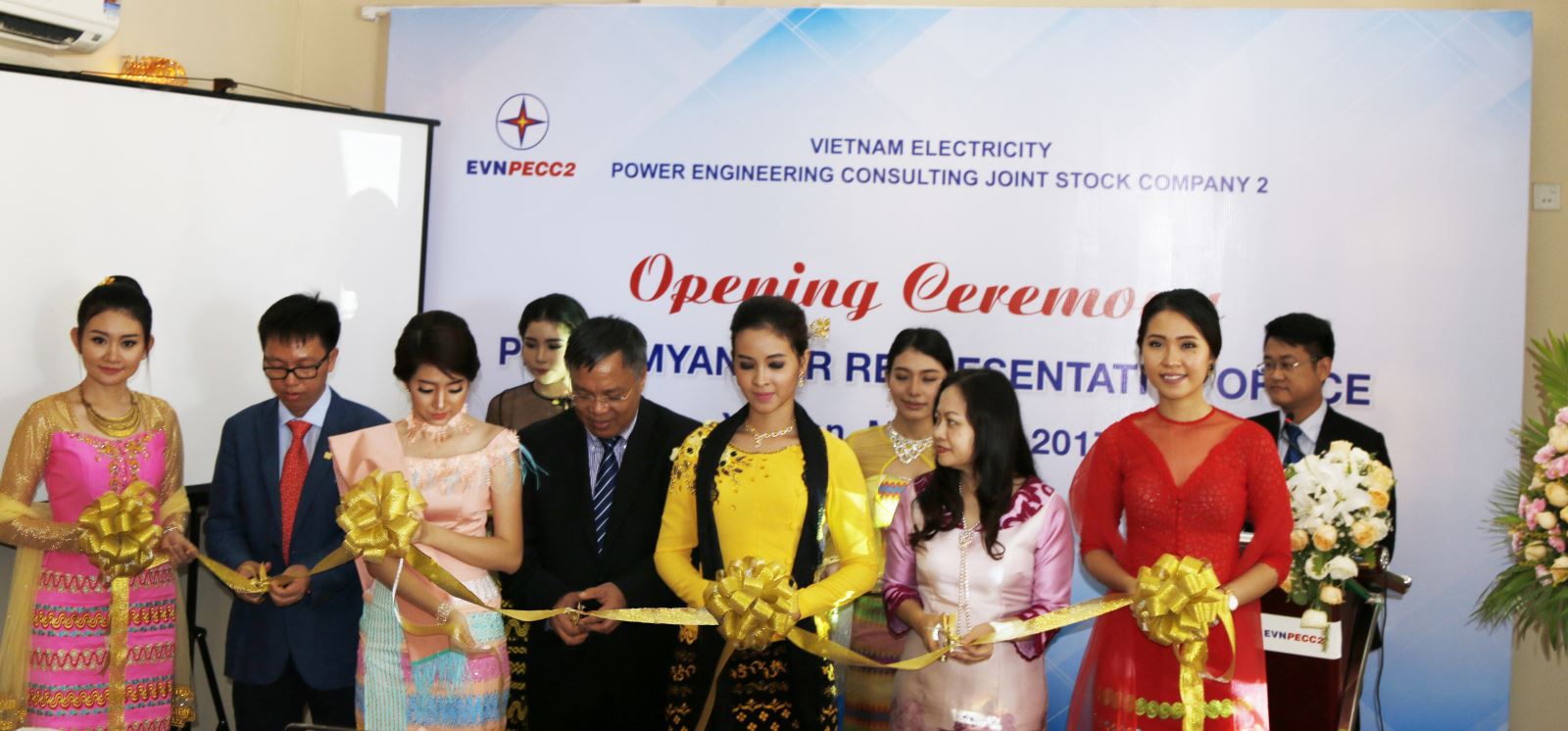 Tham dự lễ khai trương Văn phòng đại diện có bà Luận Thùy Dương - Đại sứ đặc mệnh toàn quyền Việt Nam tại Myanmar, ông Đinh Quang Tri – Phó TGĐ Tập đoàn Điện lực VN (EVN), Ban TGĐ PECC2 cùng các vị khách quý.