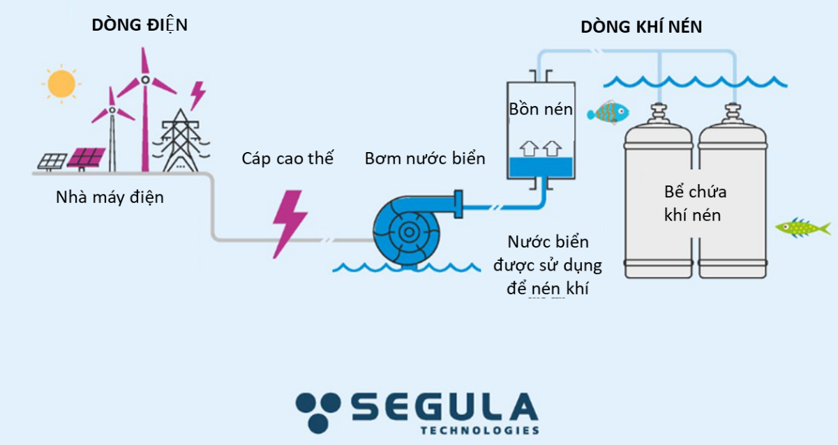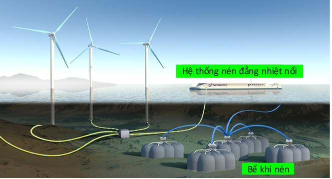 Bệ nổi kết nối với nhà máy điện thông qua cáp điện cao thế ngầm (đường vàng – Hình 2) và sau đó liên kết với bể chứa khí bằng các đường ống dẫn khí nén (đường xanh – Hình 2). Mặt khác, các bể chứa dưới đáy biển được đặt ở độ sâu từ 70 đến 200 mét dành riêng cho việc lưu trữ khí nén ở áp suất không đổi.