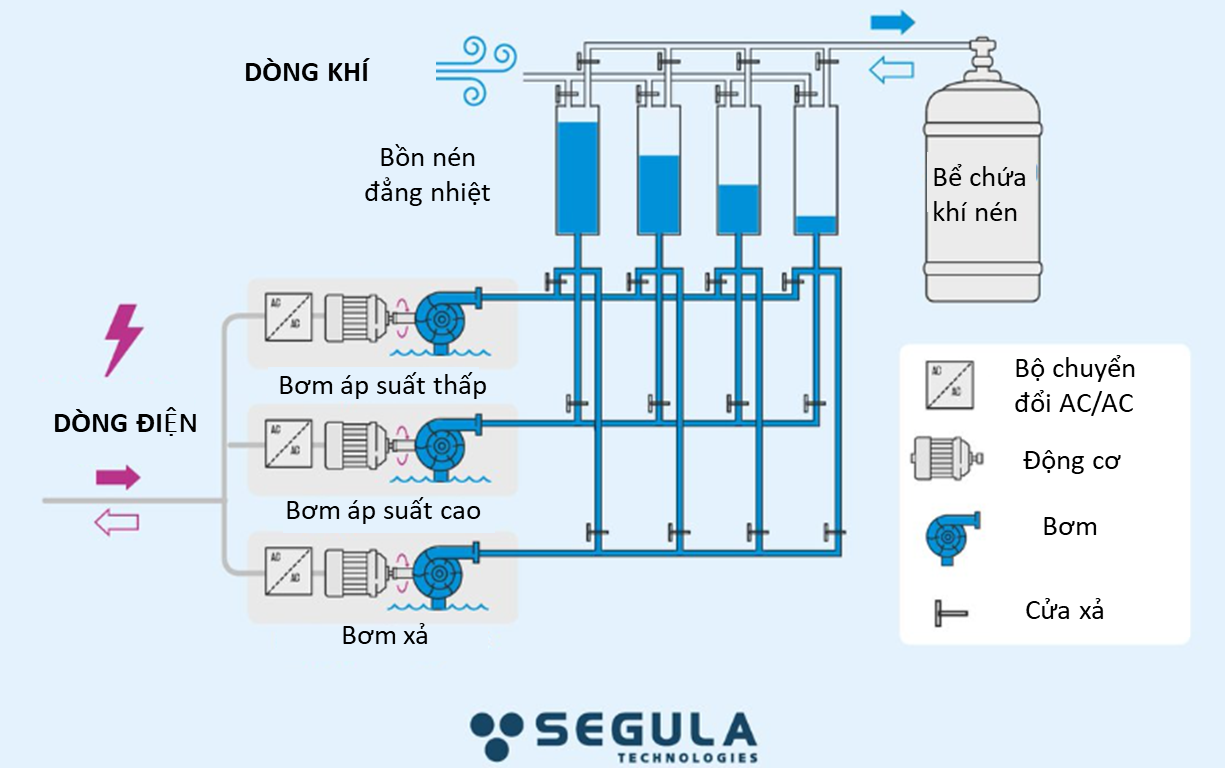 Hình 3 mô tả một hệ thống lưu trữ trên bờ được xây dựng bởi SEGULA Technologies, CETIM, Université de Nantes và IMT Atlantique (Pháp) được thực hiện vào đầu năm 2020. Theo kỳ vọng của nhà sản xuất, một hệ thống thực lưu trữ đầu tiên sẽ được lắp đặt ngoài khơi vào năm 2023.
