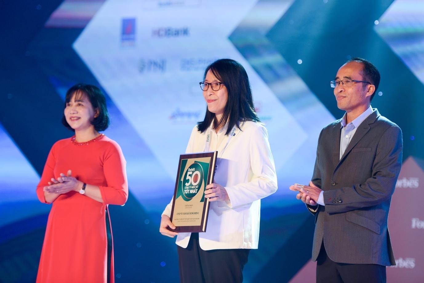 Bà Phạm Liên Hải - Phó Tổng Giám đốc PECC2 đại diện nhận giải thưởng top 50 công ty niêm yết tốt nhất năm 2020 từ Forbes Việt Nam (Nguồn: Forbes Việt Nam)