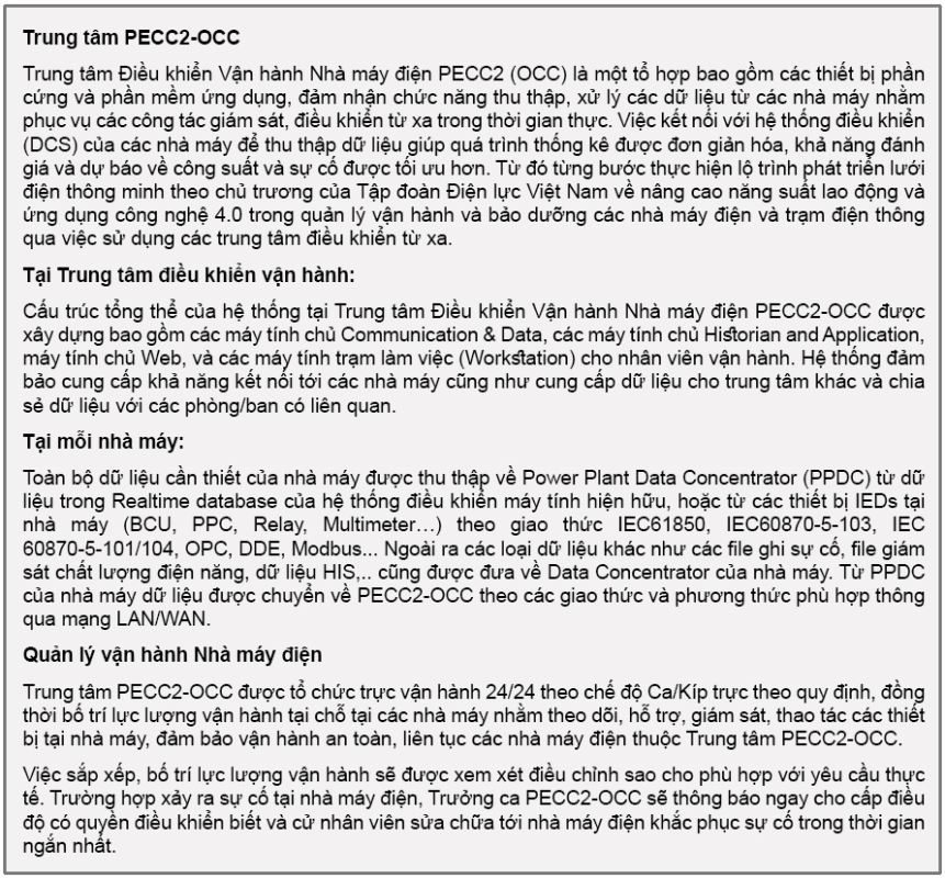 Trung tâm Vận hành Nhà máy điện điều khiển từ xa của PECC2 được đầu tư đồng bộ về công nghệ, các phần mềm quản lý vận hành tiên tiến (ANSYS, TrueTech...), và các trang thiết bị cơ sở hạ tầng hiện đại hàng đầu (Themorscan Drone camera, IV checker and PV Cleaning) đáp ứng được nhu cầu thị trường hiện tại và sự chuyên nghiệp hóa trong mô hình điều khiển Nhà máy và Trạm biến áp không người trực trong tương lai. Các kỹ sư, kỹ thuật viên đội ngũ vận hành của PECC2 đều được đào tạo bài bản về chuyên môn, có đủ các chứng chỉ chuyên ngành.