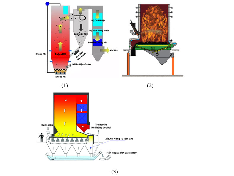 (1) – Lò hơi tầng sôi; (2) – Lò hơi phun; (3) – Lò hơi đốt ghi. Ảnh: Internet