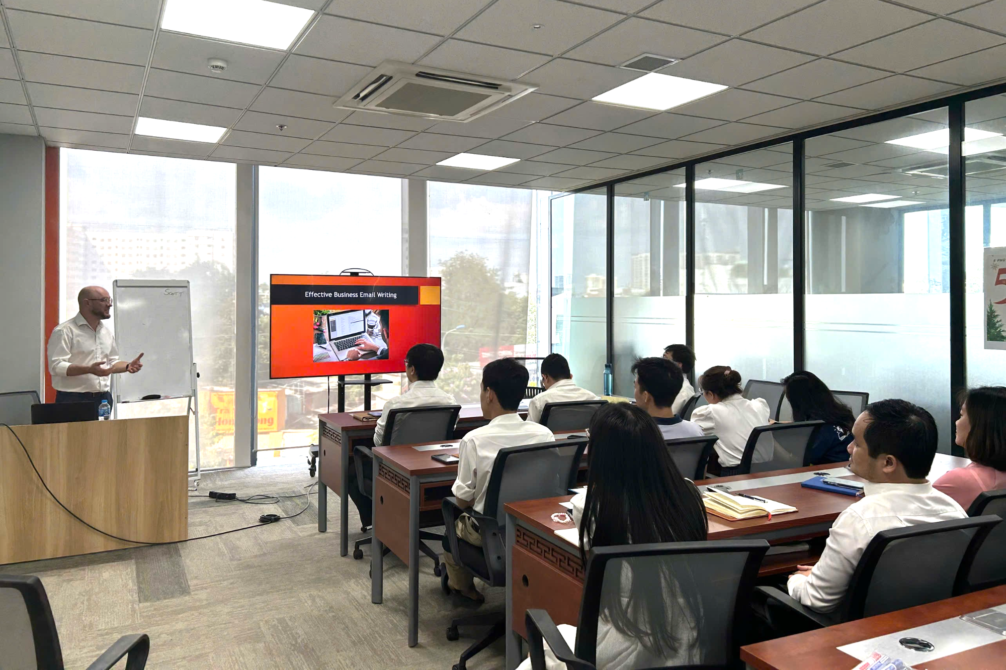 Sau phần hướng dẫn lý thuyết, các thành viên đã trực tiếp thực hành viết email theo tình huống giả định trong công việc, giúp học viên áp dụng ngay những kiến thức vừa học.