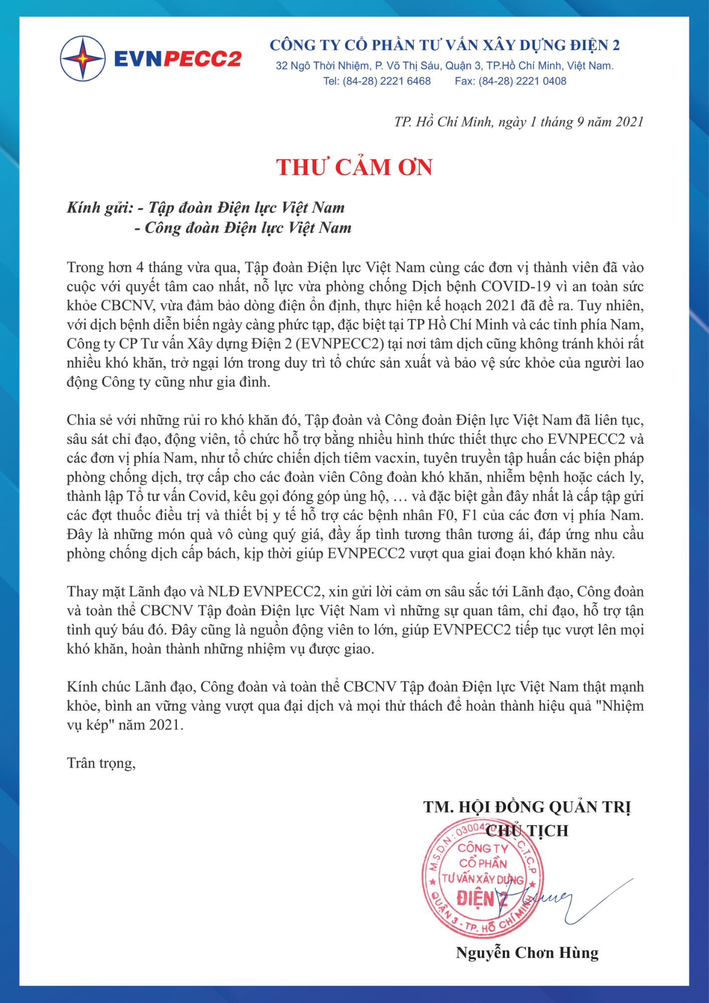 THƯ CẢM ƠN TẬP ĐOÀN ĐIỆN LỰC VIỆT NAM & CÔNG ĐOÀN ĐIỆN LỰC VIỆT NAM
